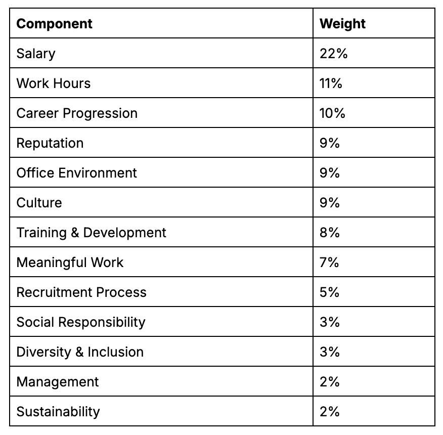 Students don’t make decisions based on a single factor. They weight multiple considerations – salary, culture, work-life balance, career growth, and reputation. But comparing employers across all these dimensions can be overwhelming.