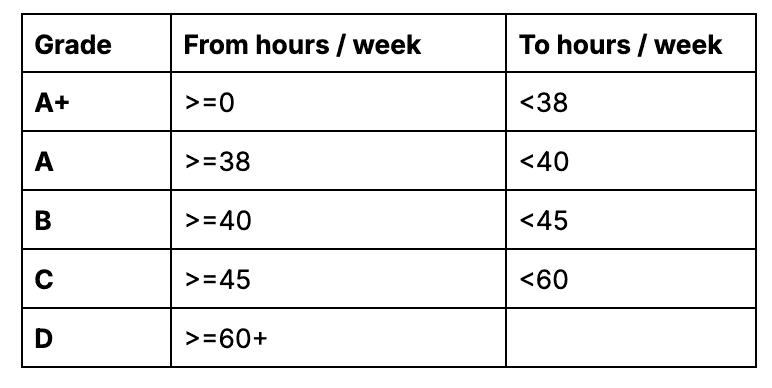 Students tell us how many hours they work. We calculate a time-weighted average which gives more significance to recent results Employers are then ranked from lowest to highest average hours worked, so students can see where balance is most achievable. Finally, grades are assigned based on the following criteria: