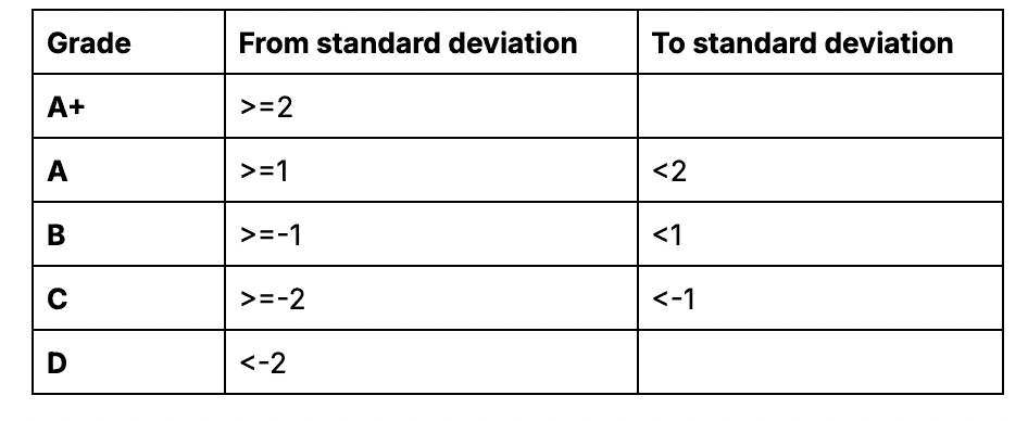 - Grades are assigned based on how many standard deviations a given employer’s salary is from the mean salary for that career path
